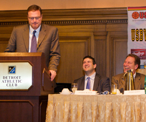 Izzo received the Good Guy Award from the USBWA because of his honesty and willingness to work with the media. "He's a guy who's great for college basketball," said Rick Bozich of the Louisville Courier-Journal who presented Izzo with the award. The breakfast began with the introduction of several members from MSU's 1979 national championship team. They received plaques commemorating the 30th anniversary of their NCAA title. Seth Davis of CBS and Sports Illustrated set the stage for the occasion with a look back at the championship game with Indian State and the match up between Magic Johnson and Larry Bird. "It was a game that transformed basketball," said Davis, who has written a new book on the subject called "When March Went Mad." The USBWA hopes to continue these breakfasts at future Final Fours, thanks in large part to the help of the NCAA in securing a site to host the event. The breakfast helps raise awareness of the organization's player and coach of the year awards and generates funds for the USBWA's scholarship program. The USBWA also makes a contribution to the National Kidney Foundation on behalf of Oscar Robertson, who donated a kidney to his daughter, Tia. Next year, plans call to honor the 1980 Louisville national championship team on the 30th anniversary of the Cardinals' NCAA title at the first Final Four ever held in Indianapolis. |